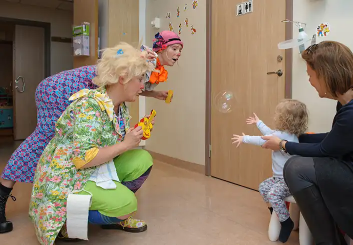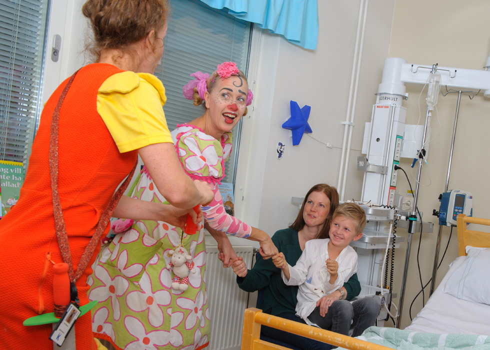 "Efter några dagar på sjukhuset var jag ju så frustrerad och mitt barn var på dåligt humör. Då kom clownerna in och började blåsa bubblor och leka med svärd när jag själv var helt slut och liksom inte viste hur jag skulle orka vända allt det negativa -då kom clownerna in och hjälpte till.” ”De...